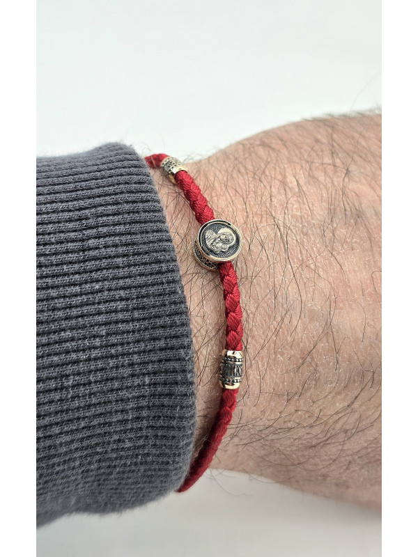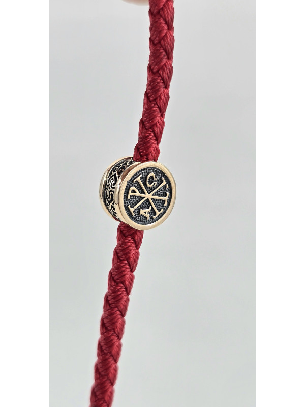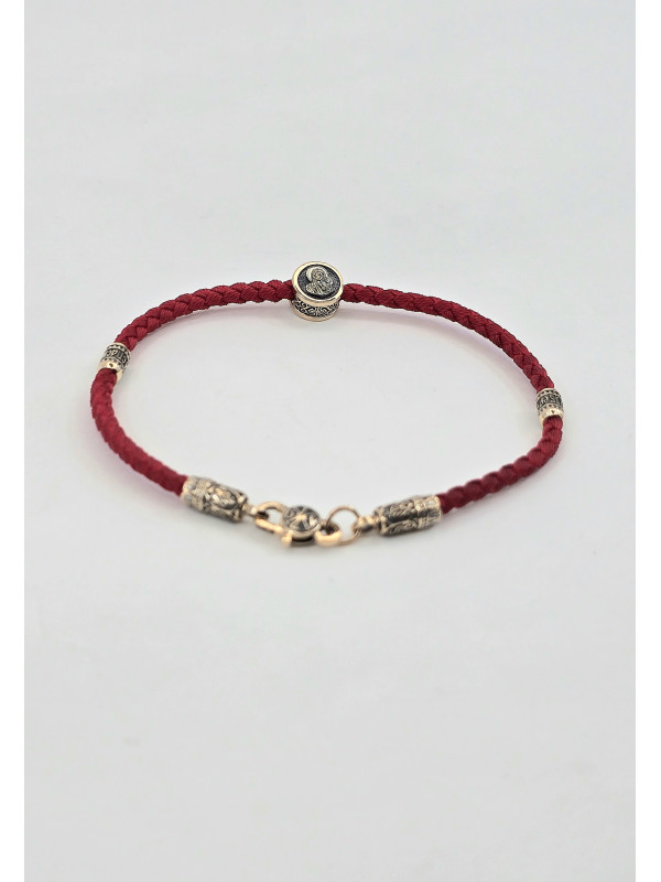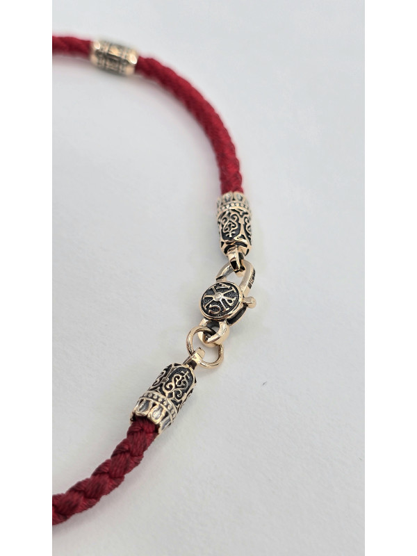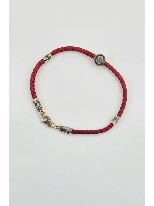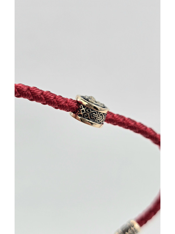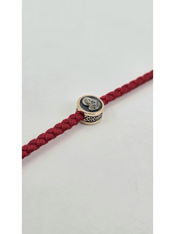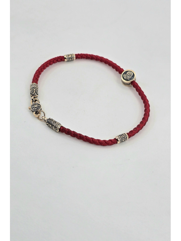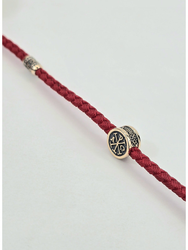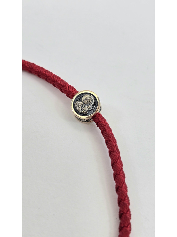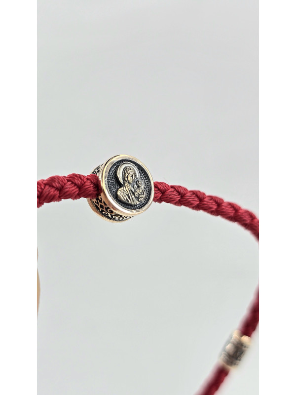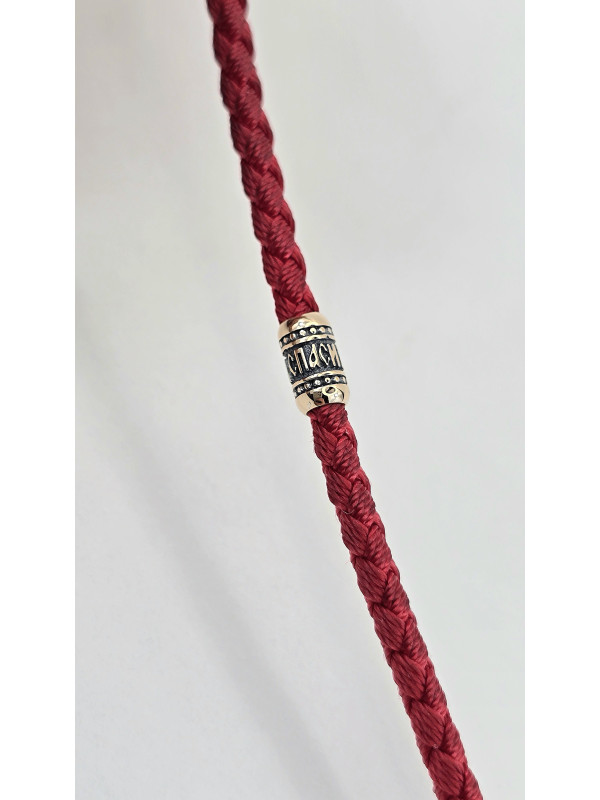 Браслет оберег с православными молитвами изготовлен  из золота 585 пробы. На шнуре представлены авторские  вставка из золота в количестве 3 шт. На центральной вставке представлен образ "Матерь Божья", две остальные вставки с краткой молитвой " Спаси и сохрани" написанной на Украинском языке. На замочке выполнен символ Христограммы . " Христограмма" - Является символом победы, защищает человека от болезней, наговоров, помогает вести честный образ жизни и обрести мудрость.   Основа браслета влагостойкий шнур полиэстер полиэфирный шелк ( Лавсан ) 3 мм . Он не раздражает кожу, долговечный, не тянется не выцветает и не линяет.