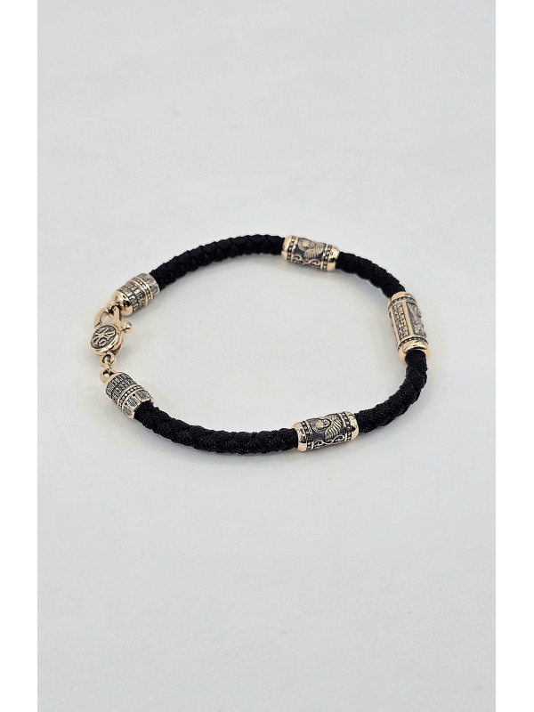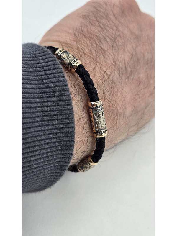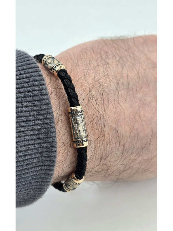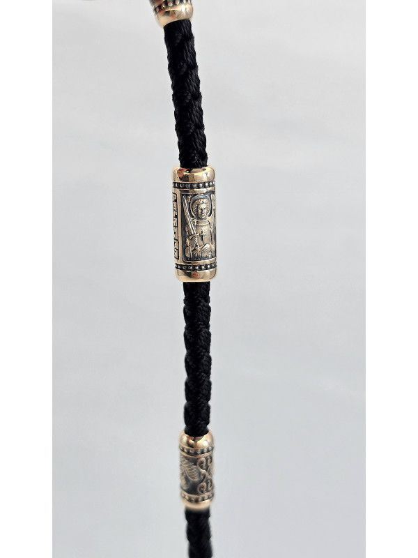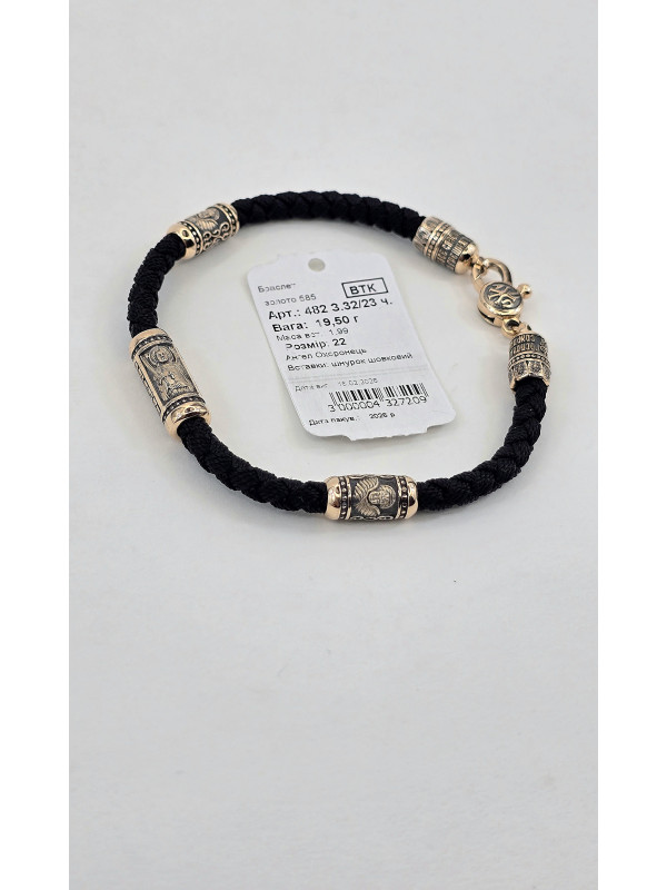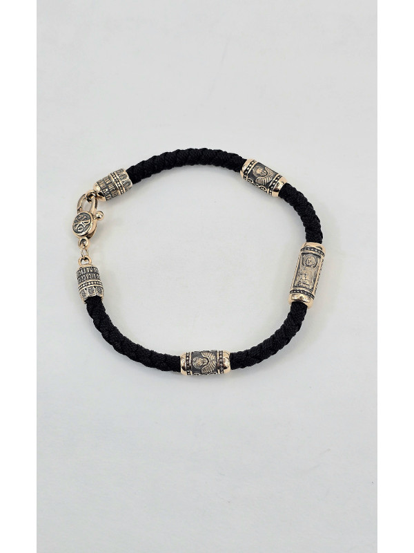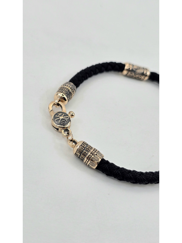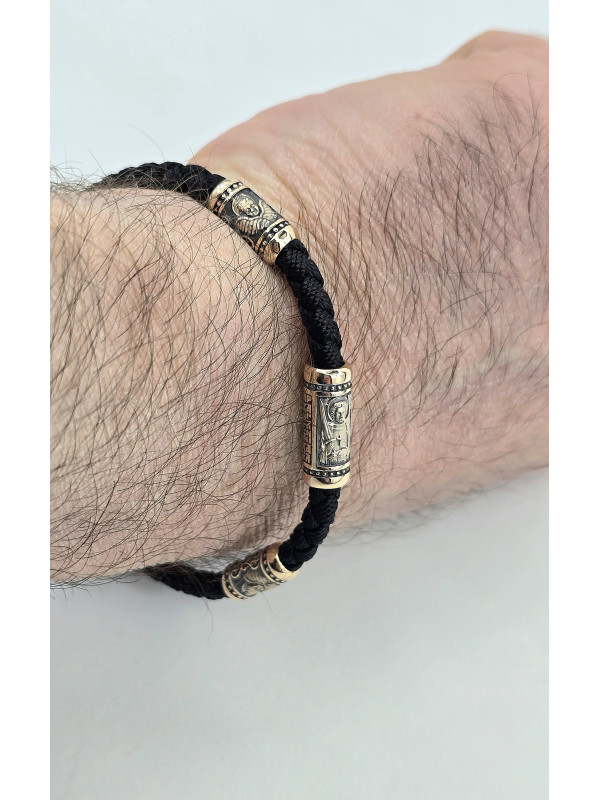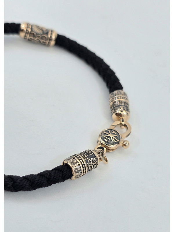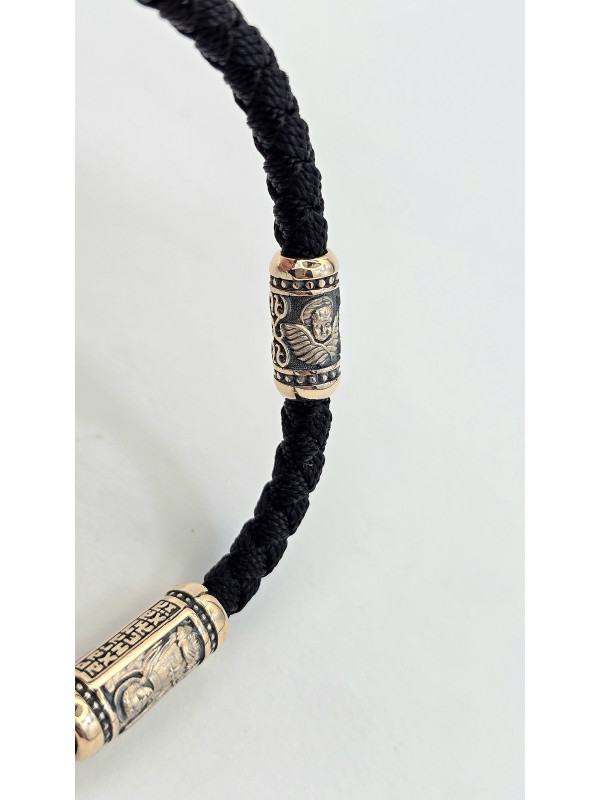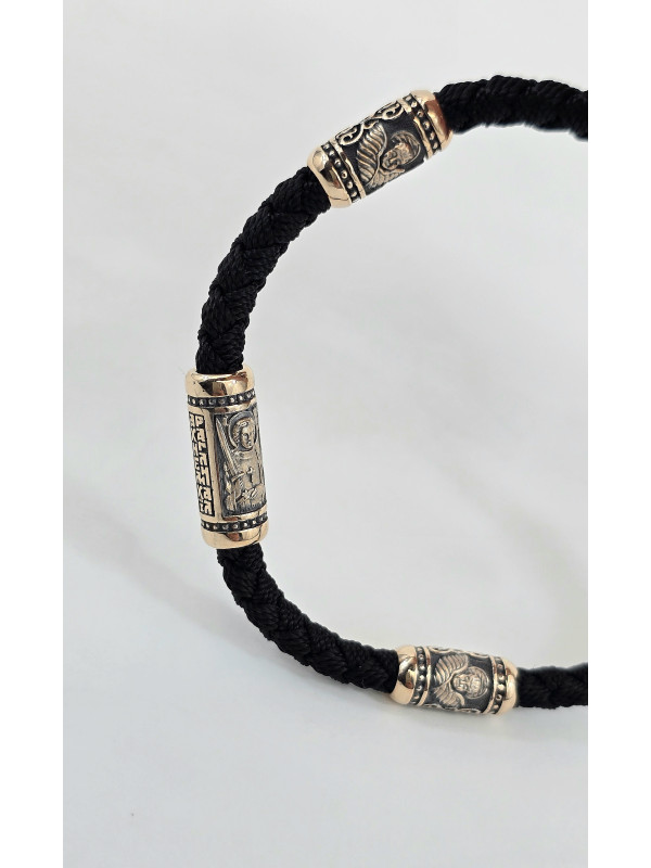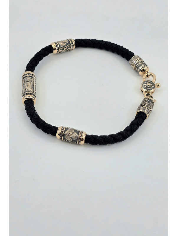 Браслет оберег с православными молитвами изготовлен  из золота 585 пробы. На шнуре представлены авторские  вставка из золота в количестве 3 шт. На центральной вставке представлен образ "Архангел Михаил", две остальные вставки с образом " Серафимов ". На замочке выполнен символ Христограммы . " Христограмма" - Является символом победы, защищает человека от болезней, наговоров, помогает вести честный образ жизни и обрести мудрость.   Основа браслета влагостойкий шнур полиэстер полиэфирный шелк ( Лавсан ) 5 мм . Он не раздражает кожу, долговечный, не тянется не выцветает и не линяет.