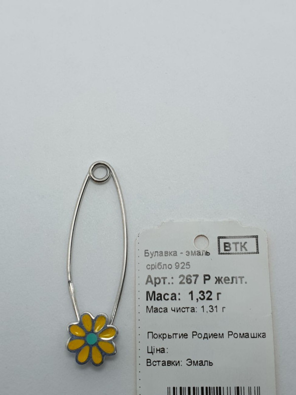 Декоративная булавка изготовлена из серебра, покрыта родием и украшена цветочком покрытым эмалью