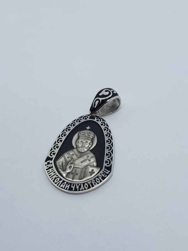 Ладанка двухсторонняя, с молитвой, с изображением Николая Чудотворца. Покрытие - родием с эмалью