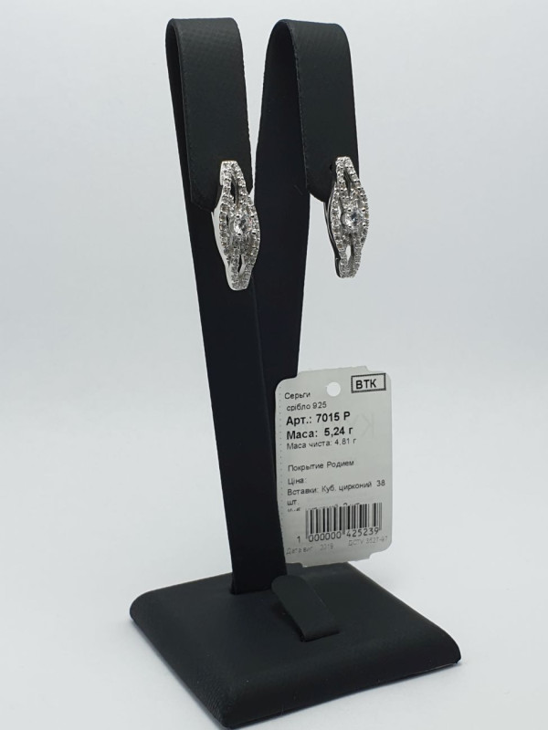 Серьги женские украшены кубическим цирконием (один больший и россыпь маленьких камней), на английской застежке. Покрыты родием
