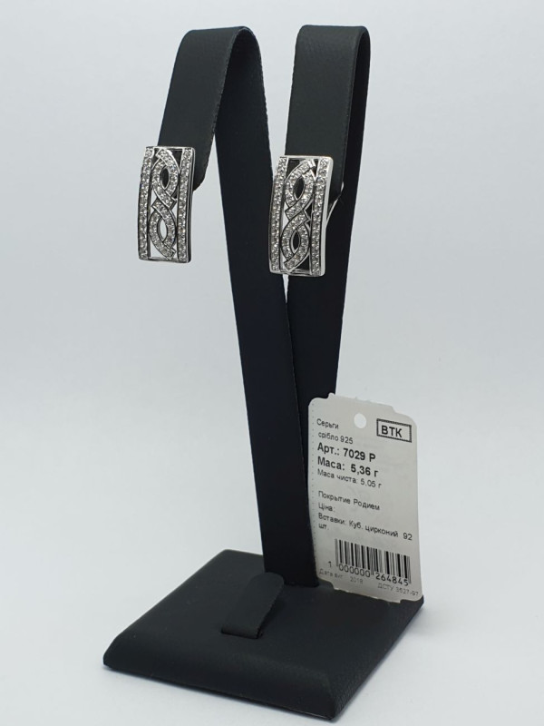 Серьги женские прямоугольные, широкие украшены кубическим цирконием (92шт), на английской застежке. Покрыты родием