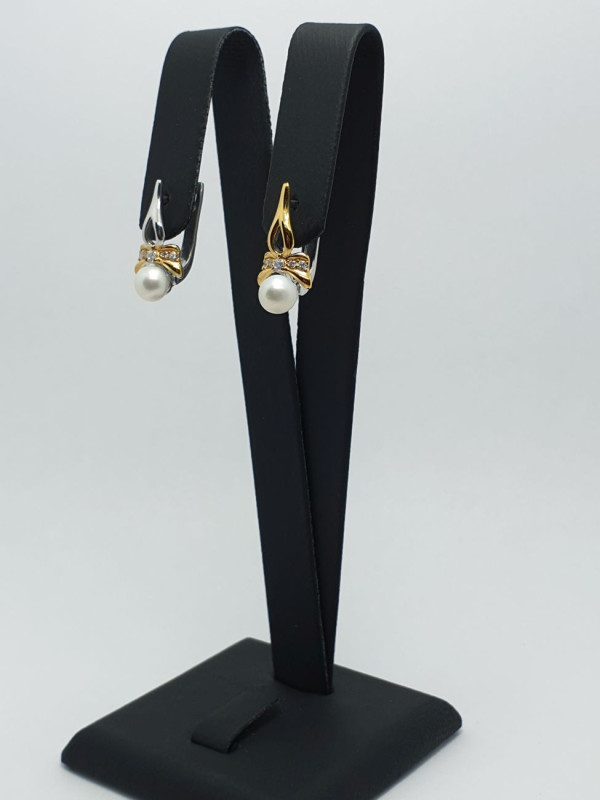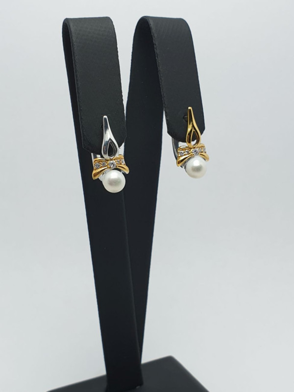 Серьги женские украшены кубическим цирконием и жемчугом, на английской застежке. Покрыты родием